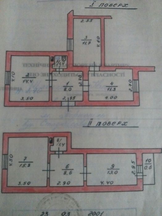 2 поверхи, 4 кімнати, роздільний санвузол. Загальна площа 85.5 м.кв., житлова 54.6 м.кв., кухня 11.3 м.кв., кам"яний підвал 29.5 м. кв. Участок 6 соток. Гараж.