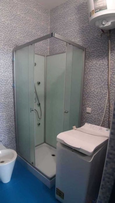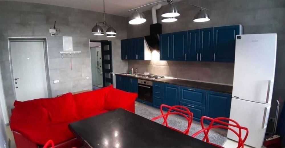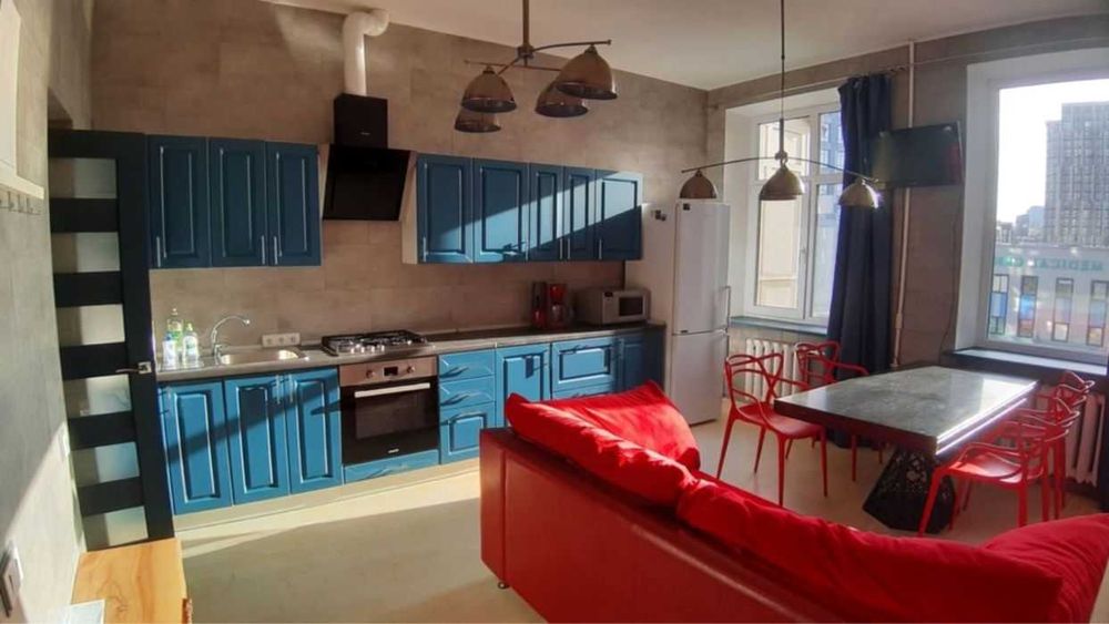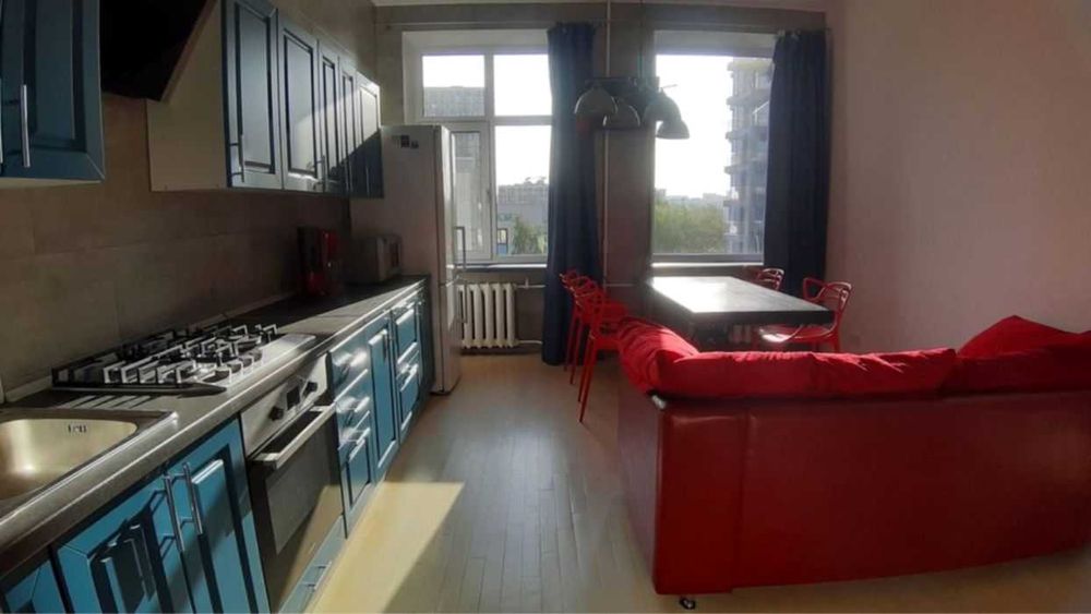 Євродвушка площею 50м (кухня-вітальня та окрема спальня). Дубовий паркет, меблі робилися під замовлення. Є газ, кондиціонер, пральна машинка, холодильник, духовка, мікрохвильовка, телевізор, пилосос, фен, посуд, інтернет.
