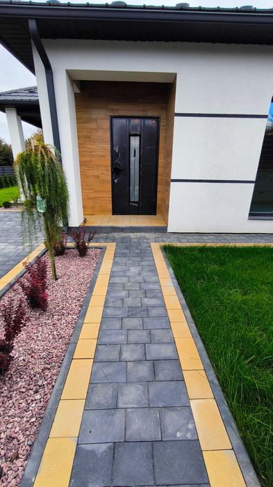 Якісна дорога бруківка Мій Двір - колір антрацит та жовтий. Темні класні поребрики.