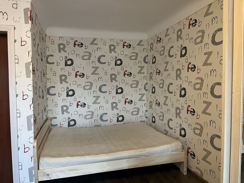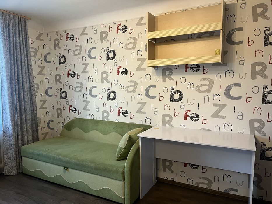 В кімнаті двохспальне ліжко, диван та шафа купе, стіл.