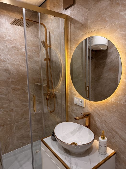 Розкішна ванна кімната в золотому стилі: душова кабіни, сучасні крани, якісна сантехніка.