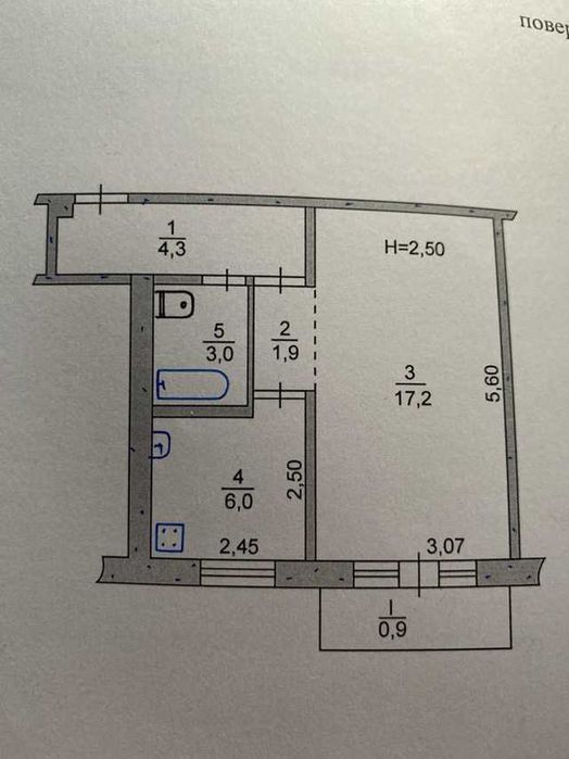 Загальною площею 33,3 м2. Розмір житлової площі квартири 17,2 м2. Кухня - 6,0 м2; ванна -3,0 м2.