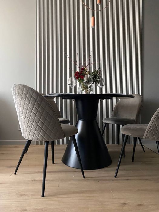 Є поличка відкрита для винних пляшок :). Італійський скляний стіл, обідня частина зонована рейками і світлодіодами.