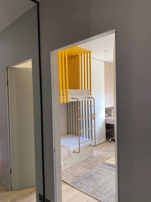 Окрема дитяча кімната: двоповерхове ліжко мрія, робилося на замовлення, металевий каркас варили за дизайн-проєктом, велюрова оббивка для затишку, підсвітка з окремими вимикачами для можливості кожній дитині читати перед сном і проводити час у своїй зоні. МОЖНА ЛІЖКО ПРИБРАТИ, воно на болтах, розбирається.
