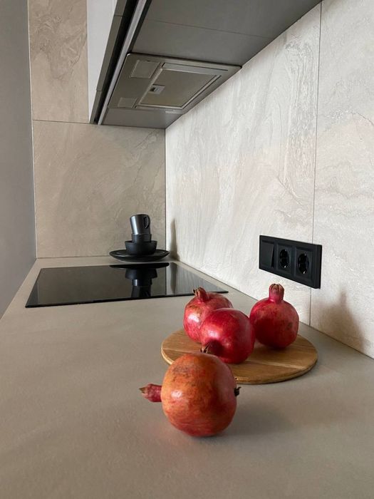 На кухні стільниця з керамограніту, вбудована мийка, посудомийка, духовка з грилем, мікрохвильовка, холодильник, чайник, індукція. Вся техніка вбудована.