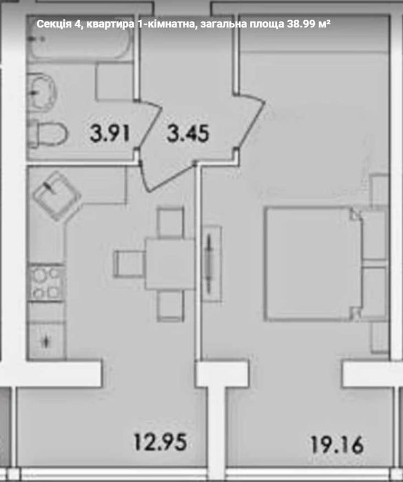 **Площа квартири:** 39 м² + комірка 2,5 м²
