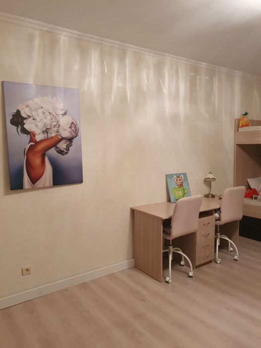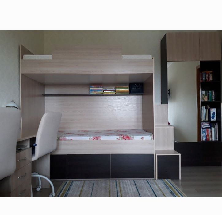 У великій кімнаті двоповерхове ліжко з ортопедичними матрасами 190 см довжиною (підійде для підлітків) зроблене на замовлення і сходинками-шухлядами на другий поверх ліжка ванна. туалет і ванна роздільні.
