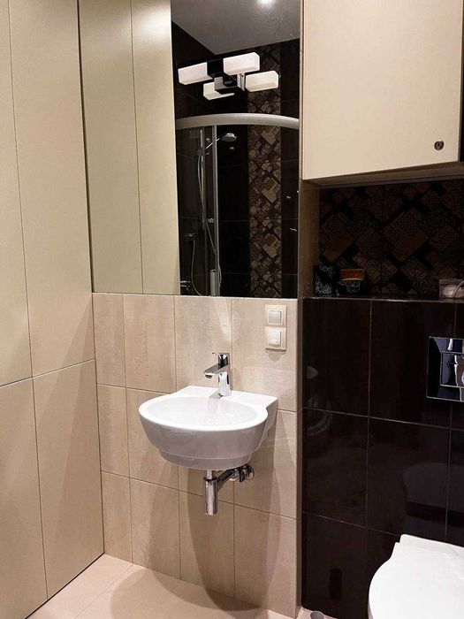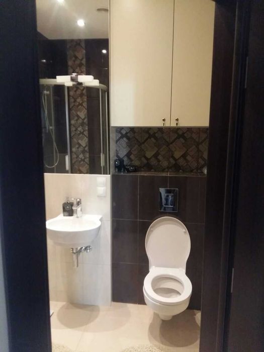 Квартира полностью мебилирована и технически оснащенна - шкафы-купе, красивая мебель, 2 кондиционера, 2 телевизора, стиральная машина, посудомоечная машина, и вообще, все мелочи, необходимые для жизни, от посуды до гладильной доски, есть.