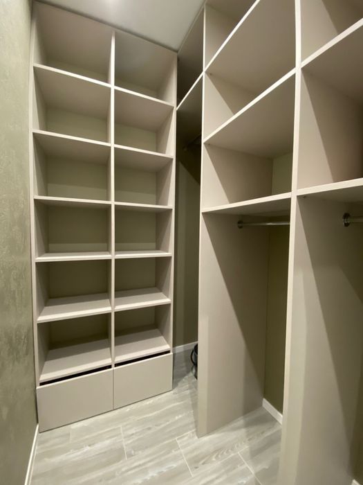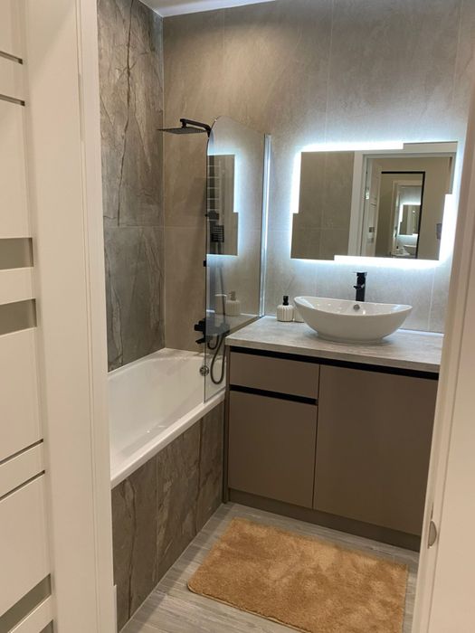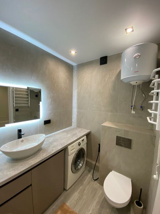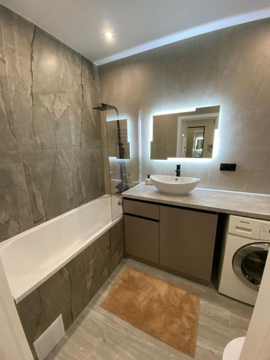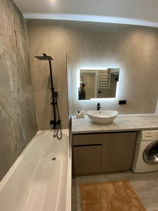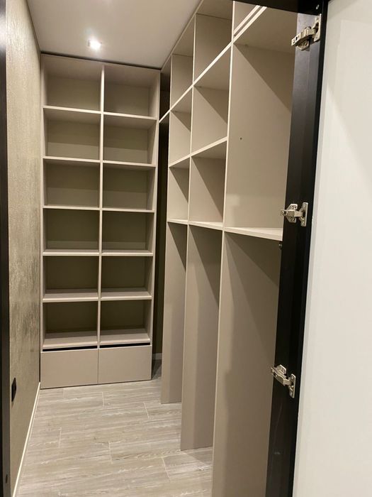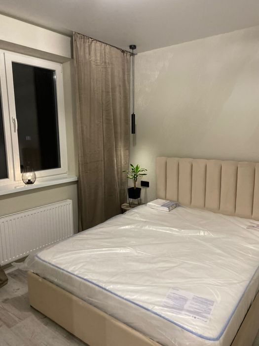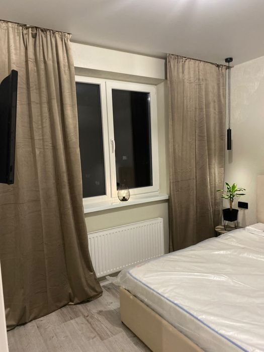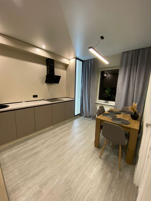 1 - комнатная квартира, кухня с выходом на балкон, выделенная зоной гостиная и спальня отдельно, просторная гардеробная, с/у совмещен ( ванная)