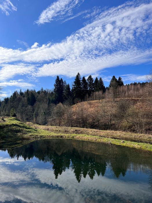 Земельна ділянка в Карпатах біля лісу та річки, власний ставок; Вартість орієнтовна за сотку, телефонуйте щоб домовитися про огляд
