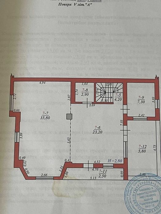 Загальна площа — 156,80 м², житлова — 94,60 м². Квартира розташована на 4–5 поверсі, має зручне планування: три великі кімнати (35,60 м², 23,20 м² та 35,80 м²), кухня 23,30 м², два санвузли, ванна кімната, лоджія, коридор і внутрішня сходова клітка. Висота стель — 2,80 м.