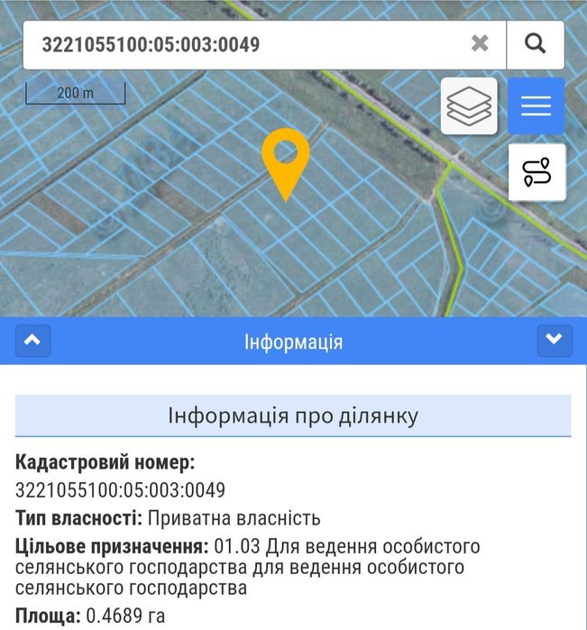 Продам ділянку біля Варшавської траси, дорога з Бородянки на Київ.; Продам земельну ділянку площею 46 соток. Кадастровий номер: 3221055100:05:003:0049. Розташована поруч з Варшавською трасою.