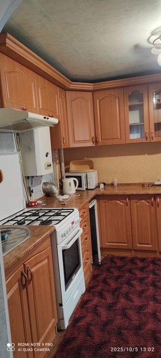 Лічильники, газовий котел, вмебльована, двоспальне ліжко, диван розкладний, ліжко півторачка, холодильник, обідній стіл, пральна машина, мікрохвильова піч, пилосос, електрочайник.