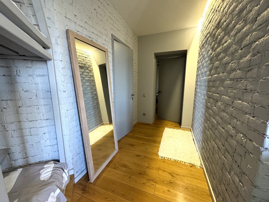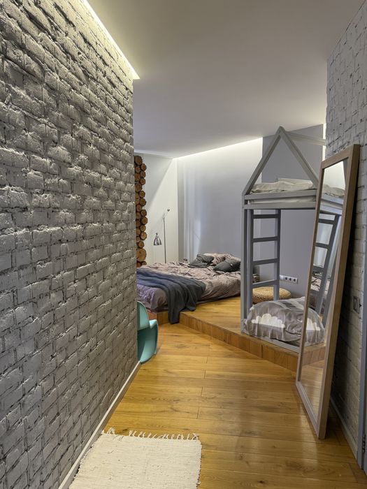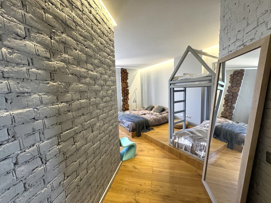 Повністю мебльована, з картинами та декором. На кухні - електроплита, чайник, блендер, гарний посуд, холодильник, міні-духовка окремо. У залі диван розкладається в двоспальне ліжко, в спальні - великий розмір матраца 2*1.80, плюс дитяче 2-ярусне ліжко. Є ковдри та подушки, постіль, рушники, якщо потрібно - теж. Вбудований гардероб і комод для зберігання речей. У передпокої - велика вбудована шафа для зберігання.