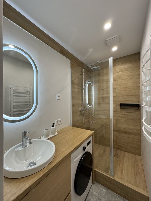В ванній кімнаті - душова, умивальник, пральна машина, електрична рушникосушарка.