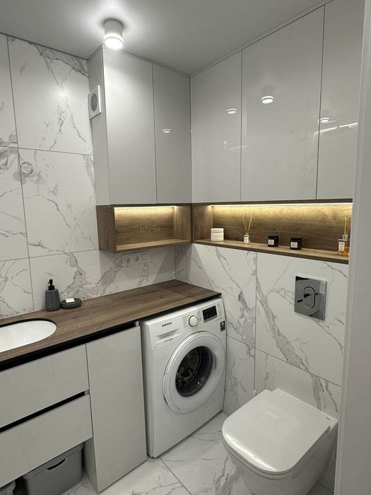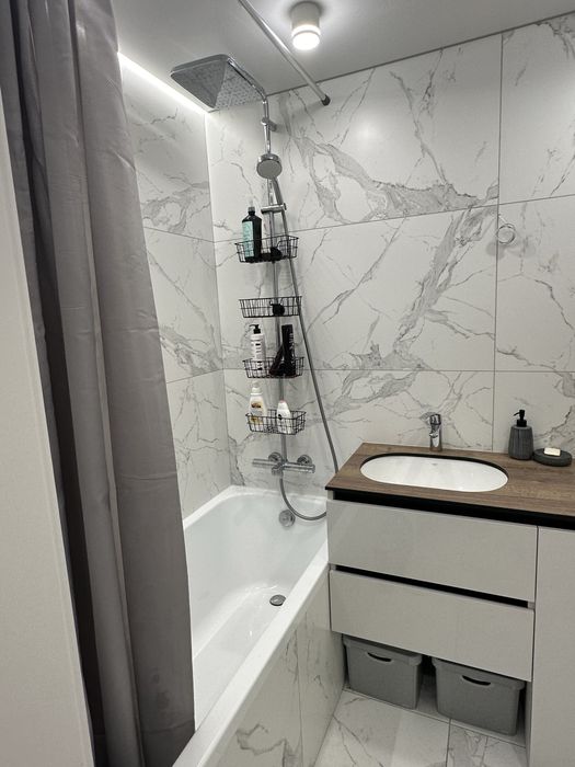 Ремонт робили для себе, встановили якісні змішувачі Grohe з тропічним душем та нагрівач Mario, сантехніка Roca та Ravak.