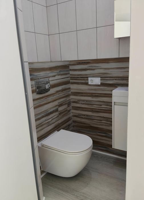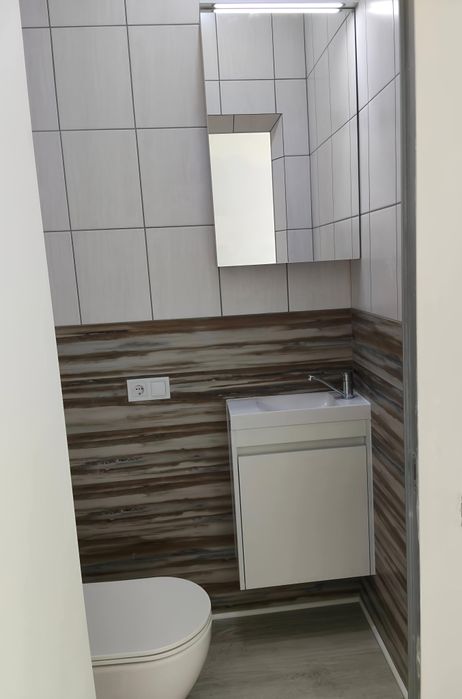 Малий санвузол: плитка, унітаз, умивальник — повністю готовий до функціонального використання