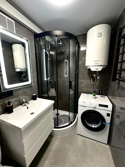 Нові меблі та техніка (диван, ліжко, 2 телевізори, підвісні комод та тумби, кондиціонер, сантехніка, пральна машина, бойлер, нові вхідні та міжкімнатні двері, шафи та кухня вбудовані (з підсвіткою), кондиціонер жодного разу не використовувались.