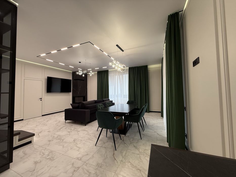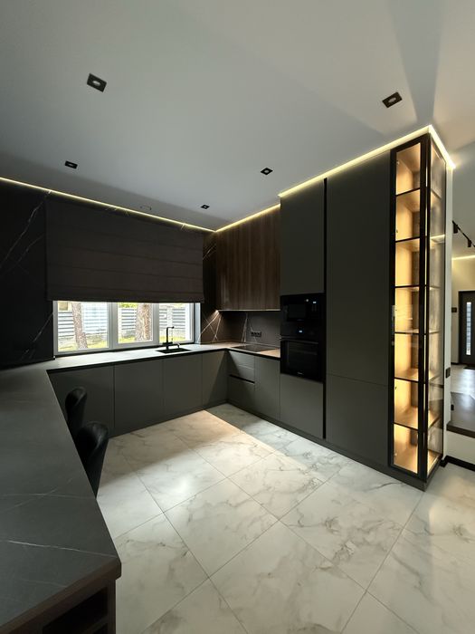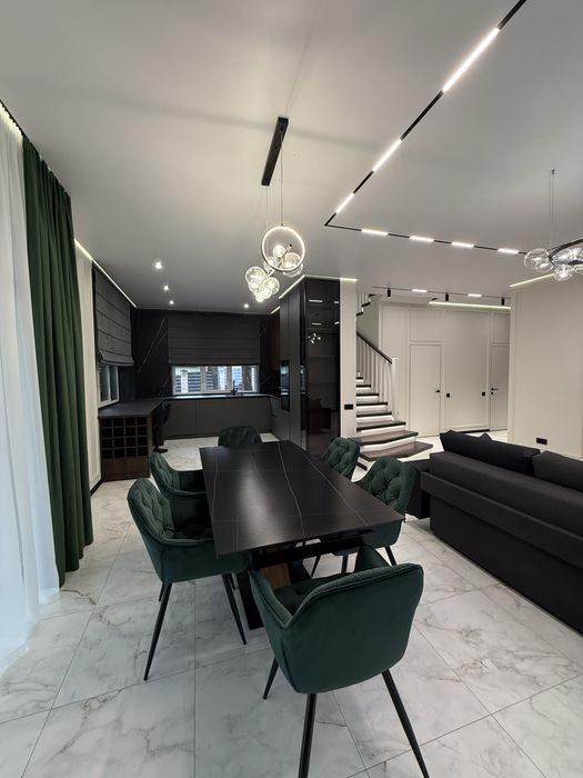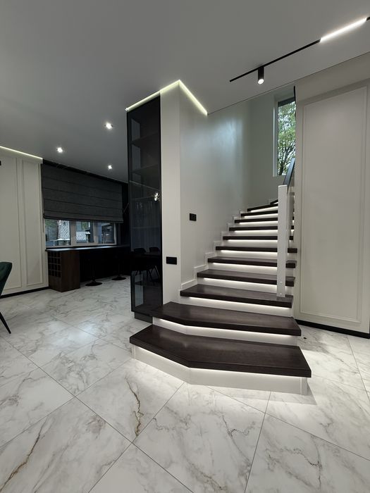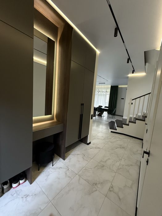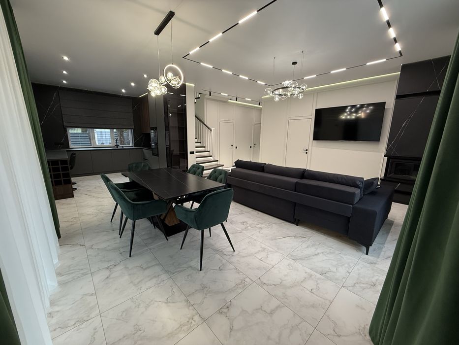 Планування: 1 поверх , висота стелі 3 м - передпокій з шафою та дзеркалом, сучасна кухня з технікою та системою очистки води для пиття, вітальня з ТВ-75 діагоналлю, диван , камін Краткі, вихід на терасу, підсобне приміщення, в якому є бойлер, котел, система очистки води на весь будинок, пральна та сушильна машинка, умивальник, окрема кімната під кабінет, сан вузол з душевою. Сходи з підсвіткою.