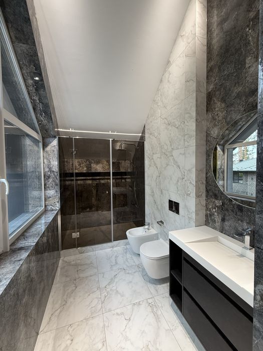 2 поверх - висота стелі 4 м, 3 спальні, 2 санвузла, гардеробна з шафами. 1 сан вузол з ваною, туалетом і біде, інший з душевою та біде. Мастер спальня зі своїм сан вузлом і гардеробною, укомплектована ліжком приліжковими тумбами та ТВ-65 діагональ. Спальня з виходом на терасу 27м2.