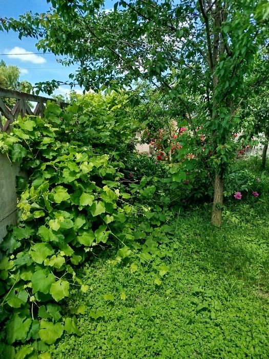 На території виноград, персики, яблука, сливи, вишні, груша. Усе гарно плодоносить.