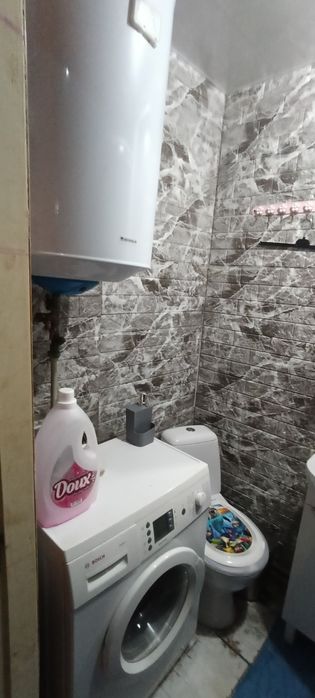 Ванна кімната оснащена плиткою, душова кабіна, унітаз та пральна машина.