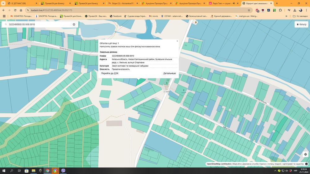 Земельна ділянка. С. Хмільна; Земельна ділянка, кадастровий номер 3222480805:05:008:0010, площею 0,1436 га, цільове призначення: для будівництва і обслуговування житлового будинку, господарських будівель і споруд (присадибна ділянка), місезнаходження: Київська обл., Бучанський район, с/рада Бузівська, с. Хмільна, вул. Спортивна.