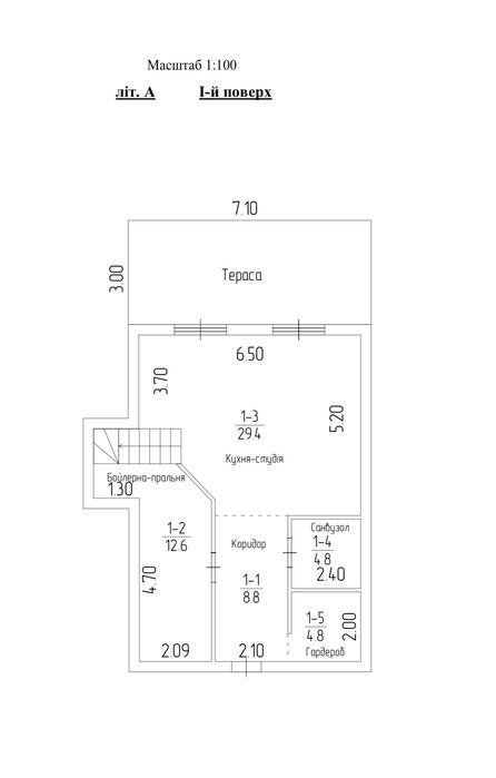 1-й поверх велика кухня-студія 35м2, гардеробна, душова кімната, пральна кімната. За потребою можно зробити ще житлову кімнату.