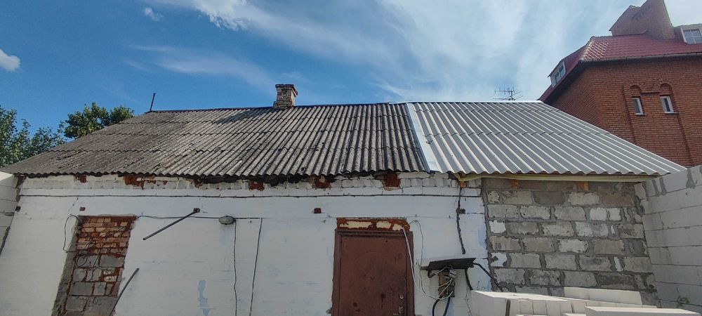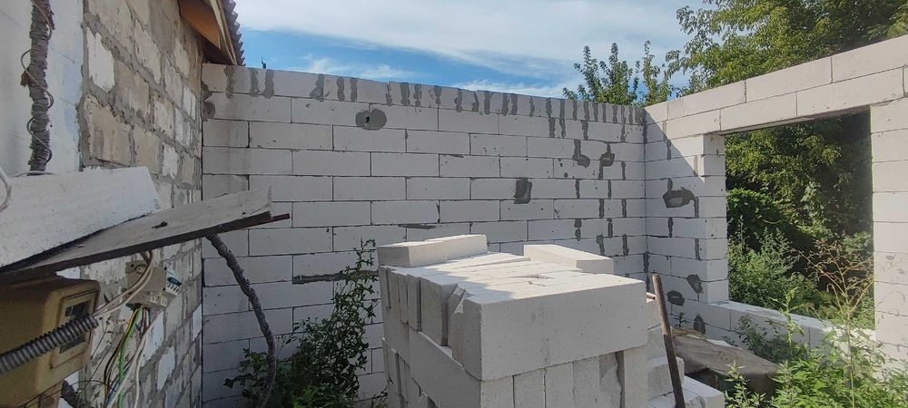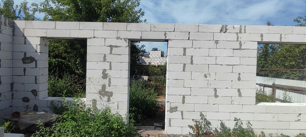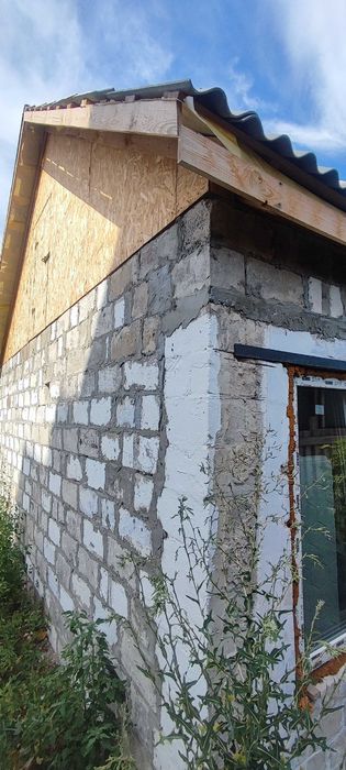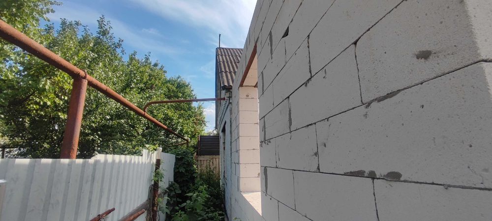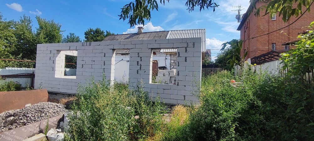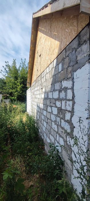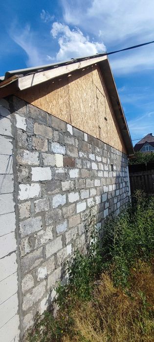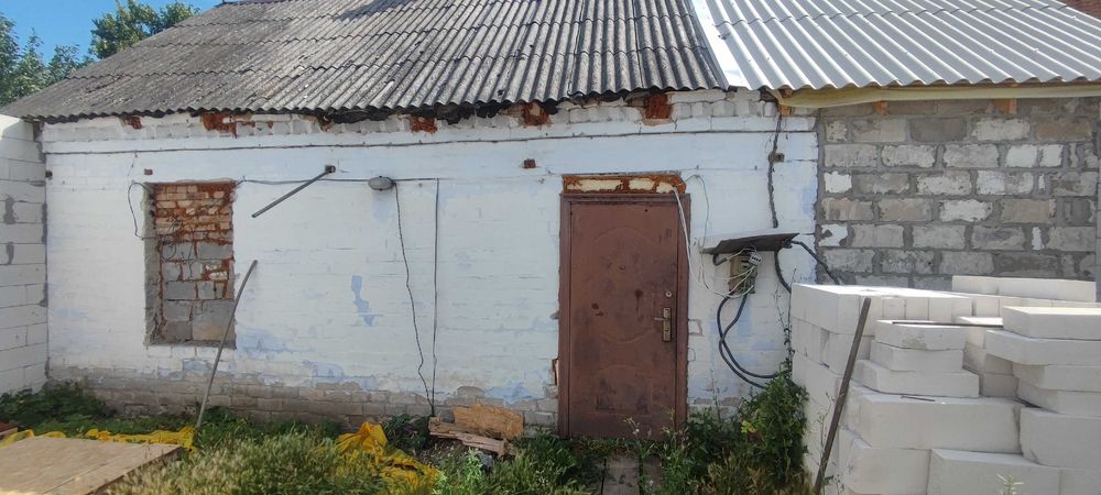 Матеріал стін: шлакоблок, обкладений цеглою; фундамент – шлакобетон; перекриття – дерево; покрівля – шифер; підлога – стяжка.