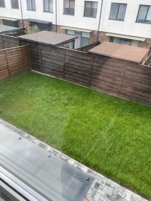 Двір з озелененням та бруківкою, металевий навіс на 2 автомобілів та парковка для 2-3 машин.