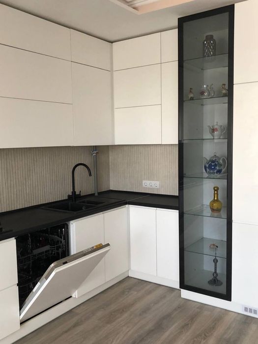 Кухня-вітальня з вбудованою технікою: варильна поверхня, духова шафа, мікрохвильова піч, холодильник, посудомийна машина, витяжка.