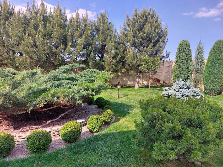 Автоматичний полив по всій ділянці. Мiсце для вiдпочинку в саду з тандиром, зоною барбекю. На території газон, безліч хвойних рослин та плодових дерев (персики, черешня, яблуні, груші, сливи), виноградник, ожина, суниця та ін.