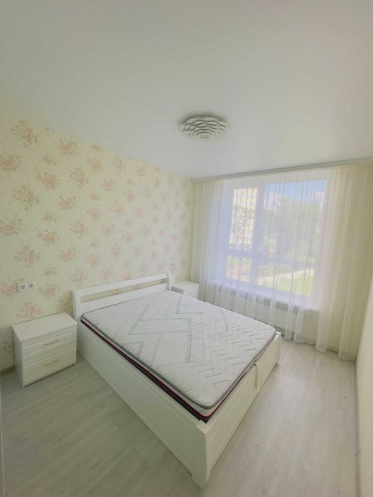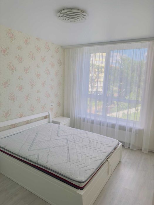 В спільній кімнаті - нове, велике двоспальне ліжко з ортопедичним матрацом та підйомним механізмом, приліжкові тумби, велика, містка шафа-купе.