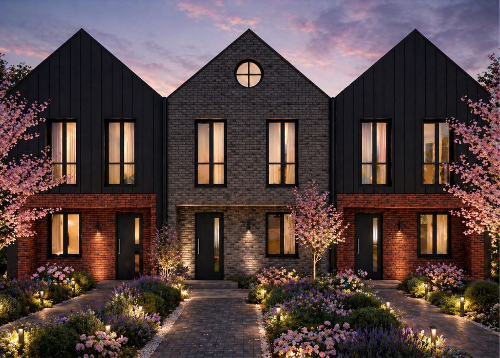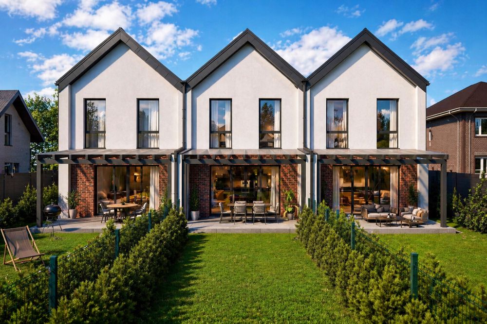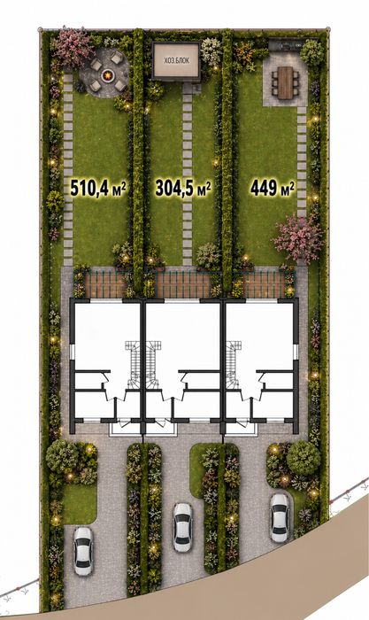 Новобудова в садах; Таунхаус 130м2 плюс мансарда 60м2, три частини на 12 сотках землі. Площі ділянок великі, на схемі вказана площа ділянки під кожною частиною тауна.