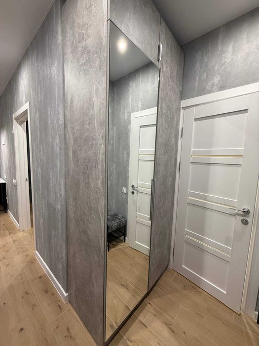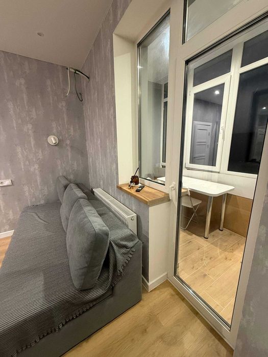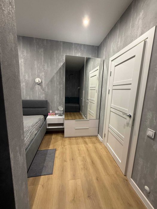 2 поверх, вікна не на сонячну сторону, два засклені балкони, гардеробна, кімната розділена на спальню та робочу зону.