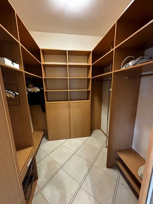 Есть комната со свободной планировкой, где есть стол и кресло, которое может использоваться как кабинет. Два санузла и тех. помещение. Большая гардеробная.