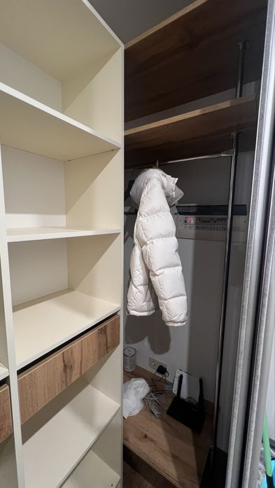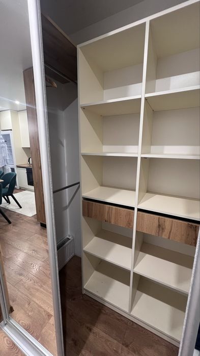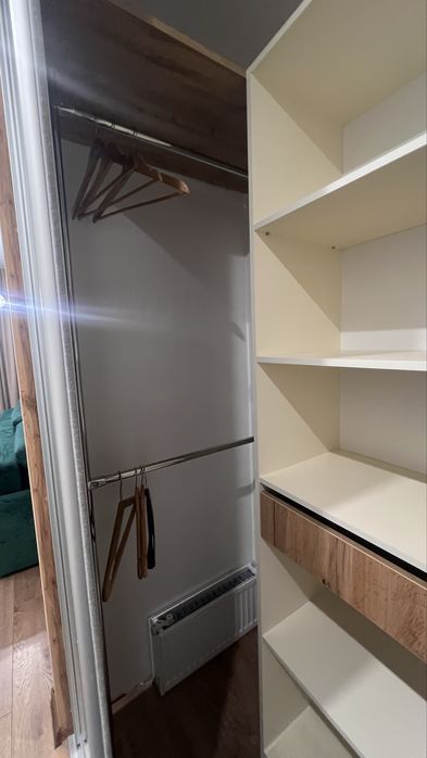 Ліжко з підйомним механізмом для зберігання речей. Шафа - гардеробна. Великий засклений балкон на всю квартиру, через це квартира тепла і коли сонячна погода на балконі взимку дуже тепло.