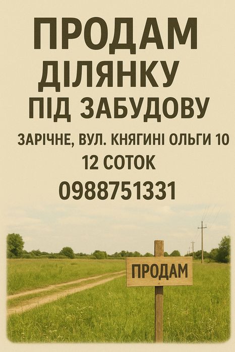Продам ділянку під забудову 12 соток Зарічне; Продам ділянку під забудову, Зарічне