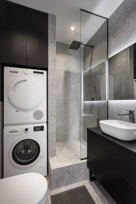 -сан вузол (душ, умивальник, дзеркало, туалет, тумбочка, пральна та сушильна машини)