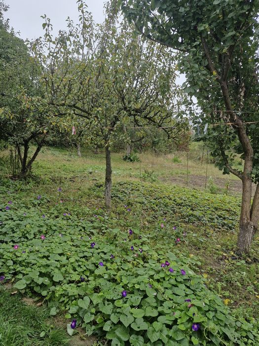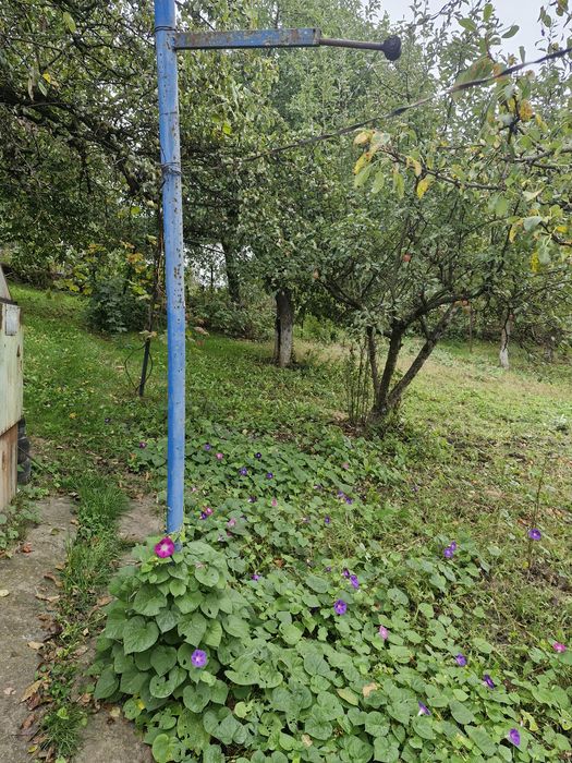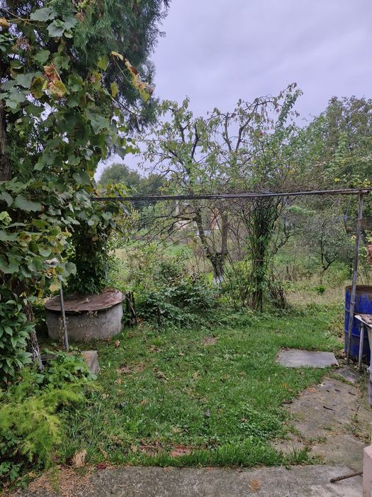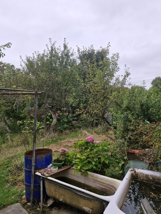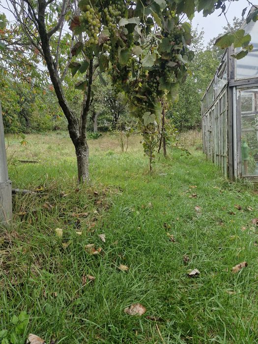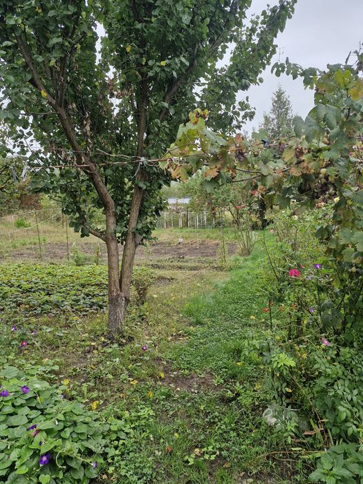 Багато плодових дерев,кущів,теплиця, місце під посадку та квіти.