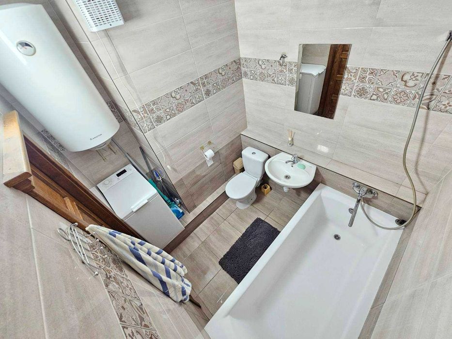 Сан. узел совмещённый, встроенная кухня с диваном.