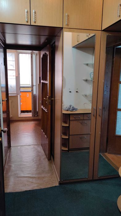 Кухню винесено на балкон. Велика кімната поділена вбудованими шафами на дві зони. По суті з однокімнатної зроблено трешка. Туалет, ванна окремі , душкабіна.
