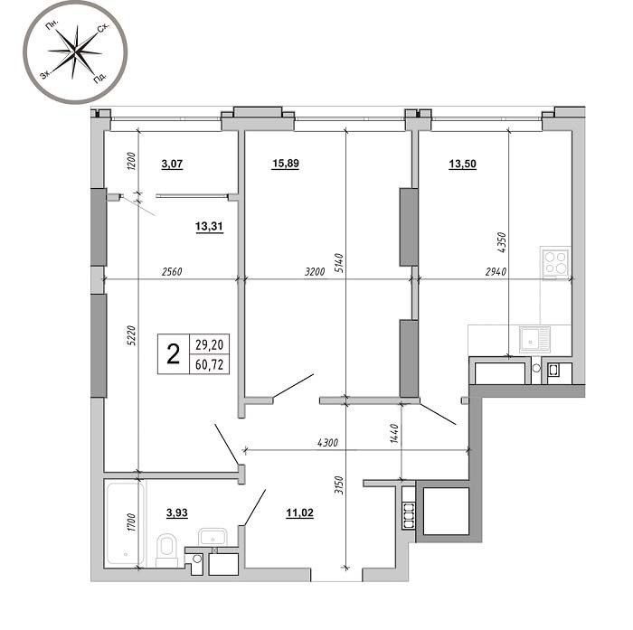 Двохкімнатна квартира 60.72 м квадратних, на 10 поверсі