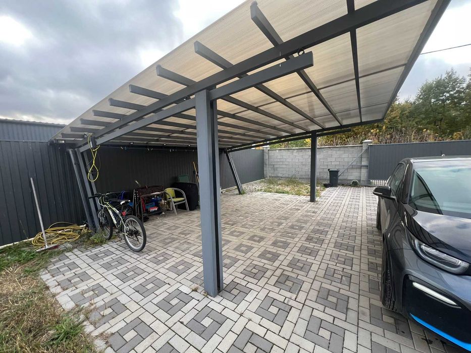 На ділянці, дорогий добротний навіс на дві машини(7000 $), автоматичний полив, свердловина 52 метри, септик з переливом 2х3 кільця по 3,5 метра (не наповнюється ніколи), багато ФЕМки, яка укладена на бетонну армовану заливку, а не грунт, паркан по периметру з автоматичними воротами, розетки для зарядки електромашин, до будинку підключено електрику з дуже великим запасом 35кВт 380 вольт, насправді вистачало б і 15кВт.