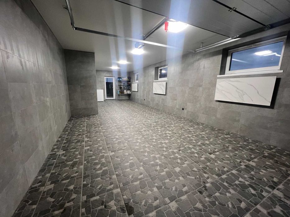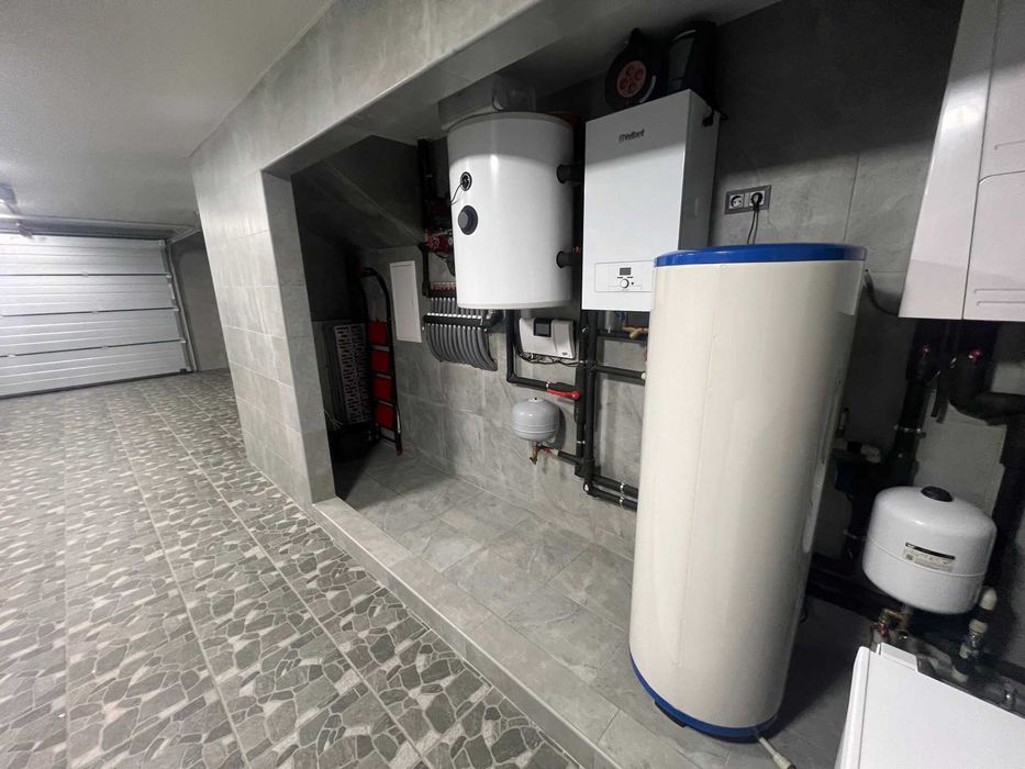 Первый уровень гараж(теплый) 44м2, на две машины, коммуникации(Тепловой Насос Электролюкс, резервный кател Вайлент, автоматы, гребенки, расширительные баки, 300 литровый бойлер для воды, фильтра итд).
