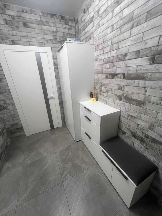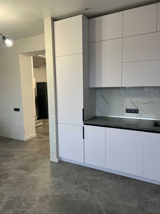Другий рівень, коридор 5м2 облицьований плиткою, хол 13м2, вітальня 21м2, кухня 23м2, кухонні меблі з вбудованою технікою, фасади двосторонні акрилові, санвузол з душовою 7м2.