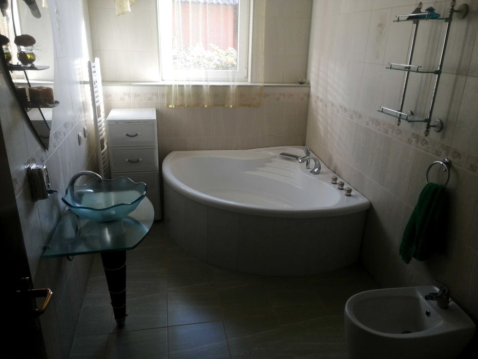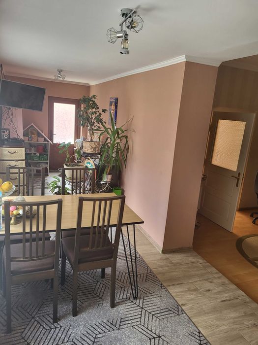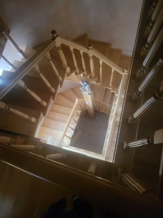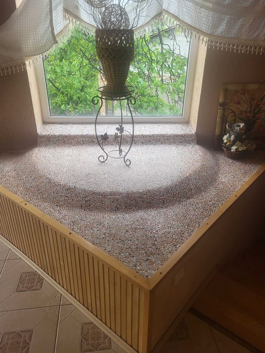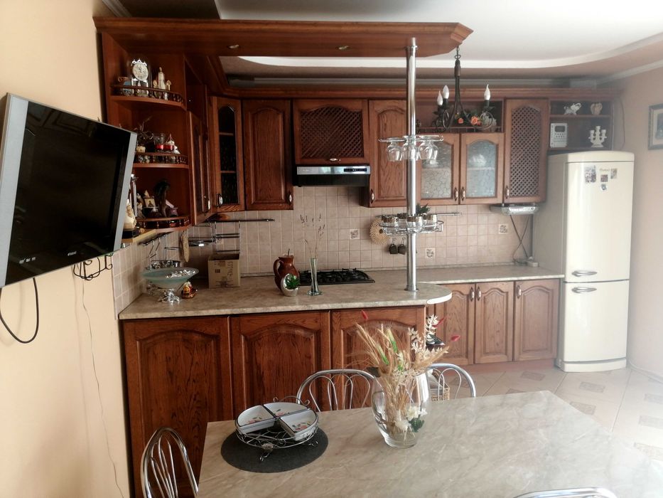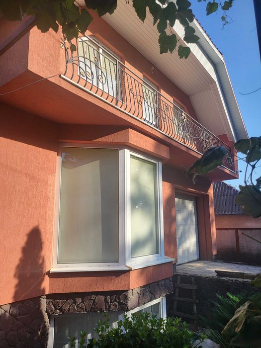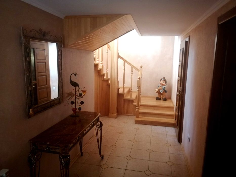 Двоповерховий будинок на 350 квадратних метрів. 3 спальні кімнати на верхньому поверсі, гостьова кімната, велика кухня 5,5 м. зроблена з дуба. В кухні панорамне вікно з шикарним виглядом на природу. Ванна. Туалет. БД. Теплий гараж із автоматичними воротами і виїздом на вулицю. В цокольному поверсі - роздягальня-гардеробна, камінна кімната, вхідний коридор, ще один гараж з заїздом з двору. Підлога - паркет бук, дуб, сходи і площадки з бука, плитка теплі поли. Три балкона. Криша металочерепиця. До опалювальної системи підключено твердопаливний та газовий котел.