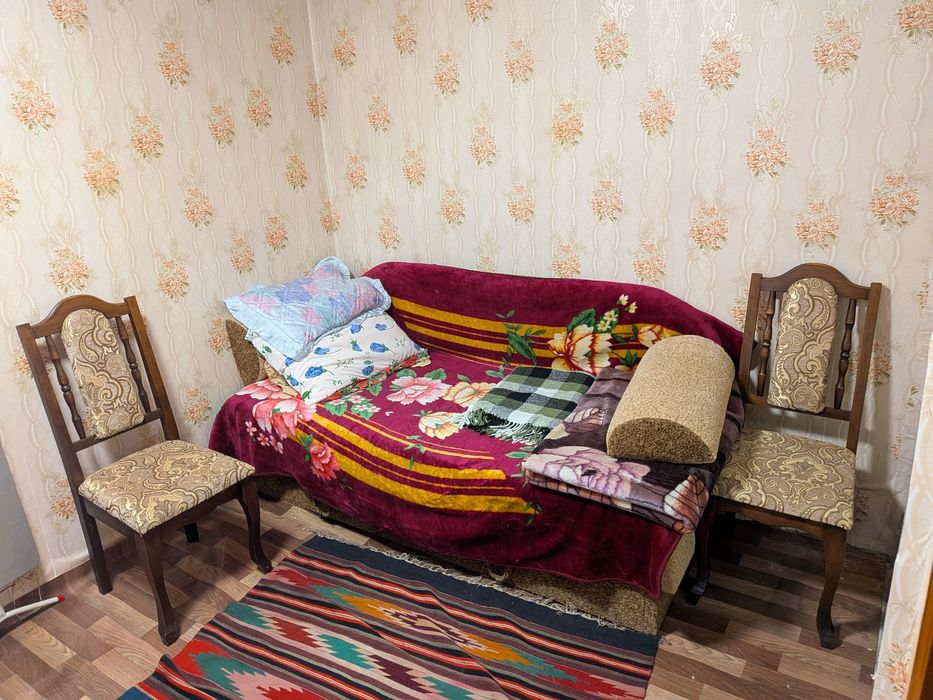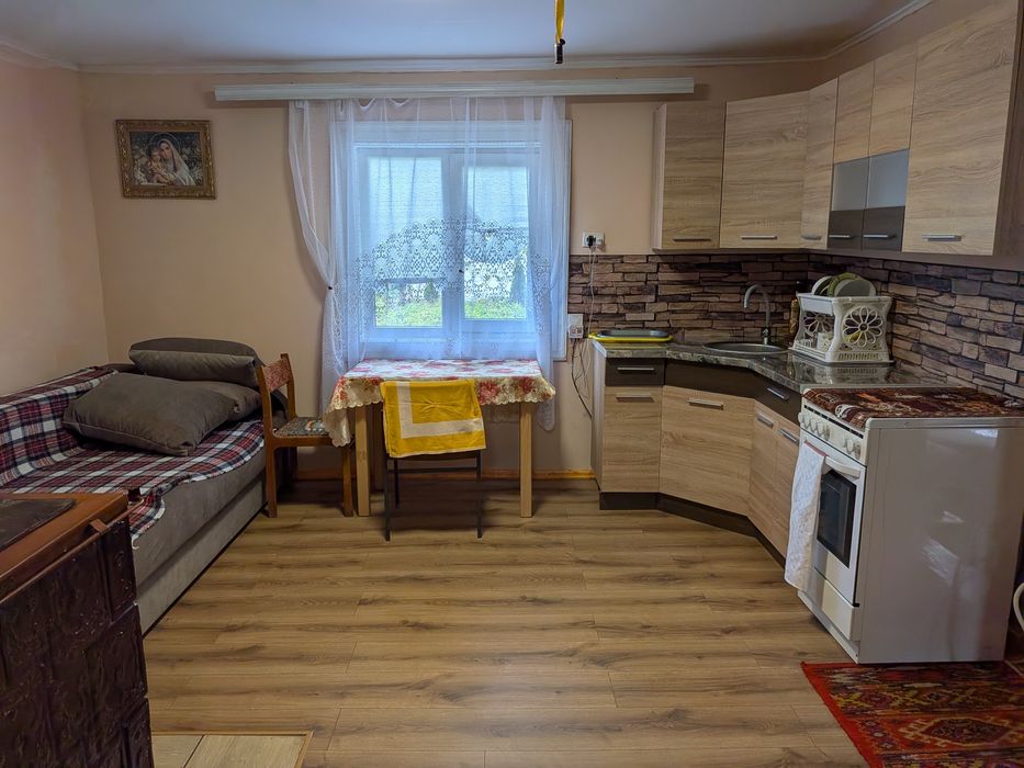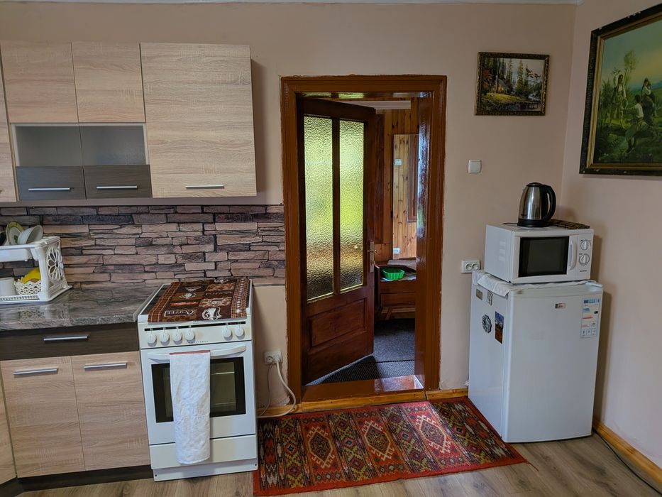 1 спальна кімната, 1 кімната студія (піч на дровах, диван розкладний, кухня, електрична плита, стіл, маленький холодильник і мікрохвильова піч)