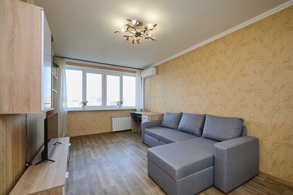 Велике вікно в кімнаті робить її дуже світлою та просторою. Дуже гарний панорамний краєвид на лівий берег Києва.