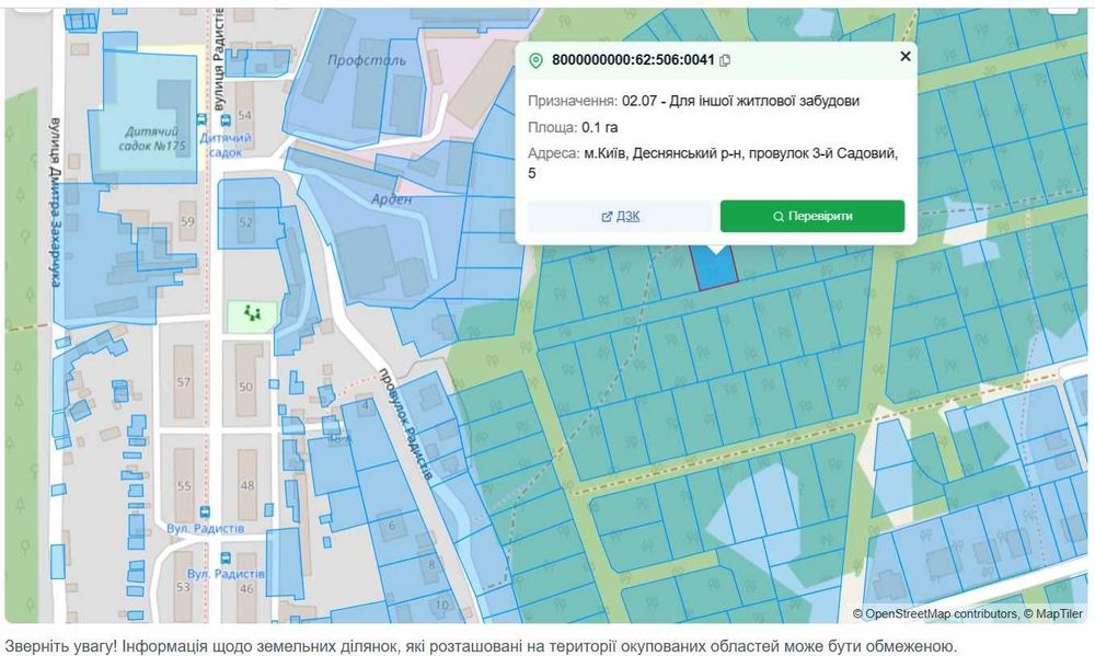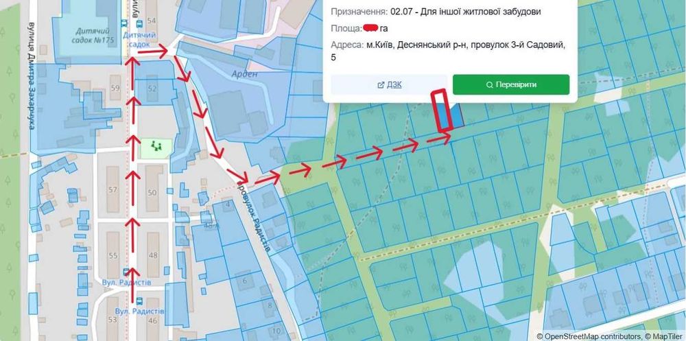 До земельної ділянки прокладені і підключенні електричні мережі (електроопори, кабель), на ділянці встановлено вузол обліку електроенергії потужність 15 кВт 3-и фази 400 В, повідомлення про приєднання до договору про постачання електричної енергії постачальником діючий. Розроблена, погоджена і отримана дозвільна документація на нове будівництво Дозвільна документація: -проект будівництва -план М1:500 -план М1:2000 -генеральний план М1:500 -містобудівні умови і обмеження -повідомлення про початок виконання будівельних робіт «Нове будівництво індивідуального житлового будинку (садибного типу) за адресом: провулок 3- й Садовий, 5 у Деснянському районі м. Києва» діюче. Транспортна доступність: Поруч проходить вул. Радистів по якій курсує міський громадський транспорт, автобус маршрут №11,11Д. Від земельної ділянки пішки 5 хвилин до автобусної зупинки Дитячій садок на вул. Радистів, на автобусі 5-10 хвилин до метро Лісової, автобусна зупинка ЖК Лісова Казка – Школа, Продуктовий маркет Пчілка, Кав’ярні, Нотаріус, Аптека, Овочевий магазин , відділення Укрпошти 02089 і інша комерційна агломерація. Переваги: Прекрасне місце для будівництва приватного будинку в місті Київ. Сусіди суміжних ділянок ведуть будівельні роботи. На нашій вулиці, провулок 3- й Садовий, всі власники земельних ділянок активно ведуть підготовчі і будівельні роботи. Загальні відомості про земельну ділянку: Кадастровий номер: 8000000000:62:506:0002 ( ця ділянка утворилася після розподілу земельної ділянки 8000000000:62:506:0041 площею 0,1000 га на дві земельні ділянки площею по 0,0500 га за кадастровими номерами 8000000000:62:506:0001 і 8000000000:62:506:0002) Місце розташування: (адміністративно територіальна одиниця): місто Київ, Деснянський район, провулок 3-й Садовий, 5 Категорія земель: Землі житлової та громадської забудови Вид цільового призначення земельної ділянки: 02.07 Для іншої житлової забудови Вид використання земельної ділянки: Для будівництва та обслуговування житлового будинку, господарських будівель і споруд Площа земельної ділянки, гектарів: 0,0500